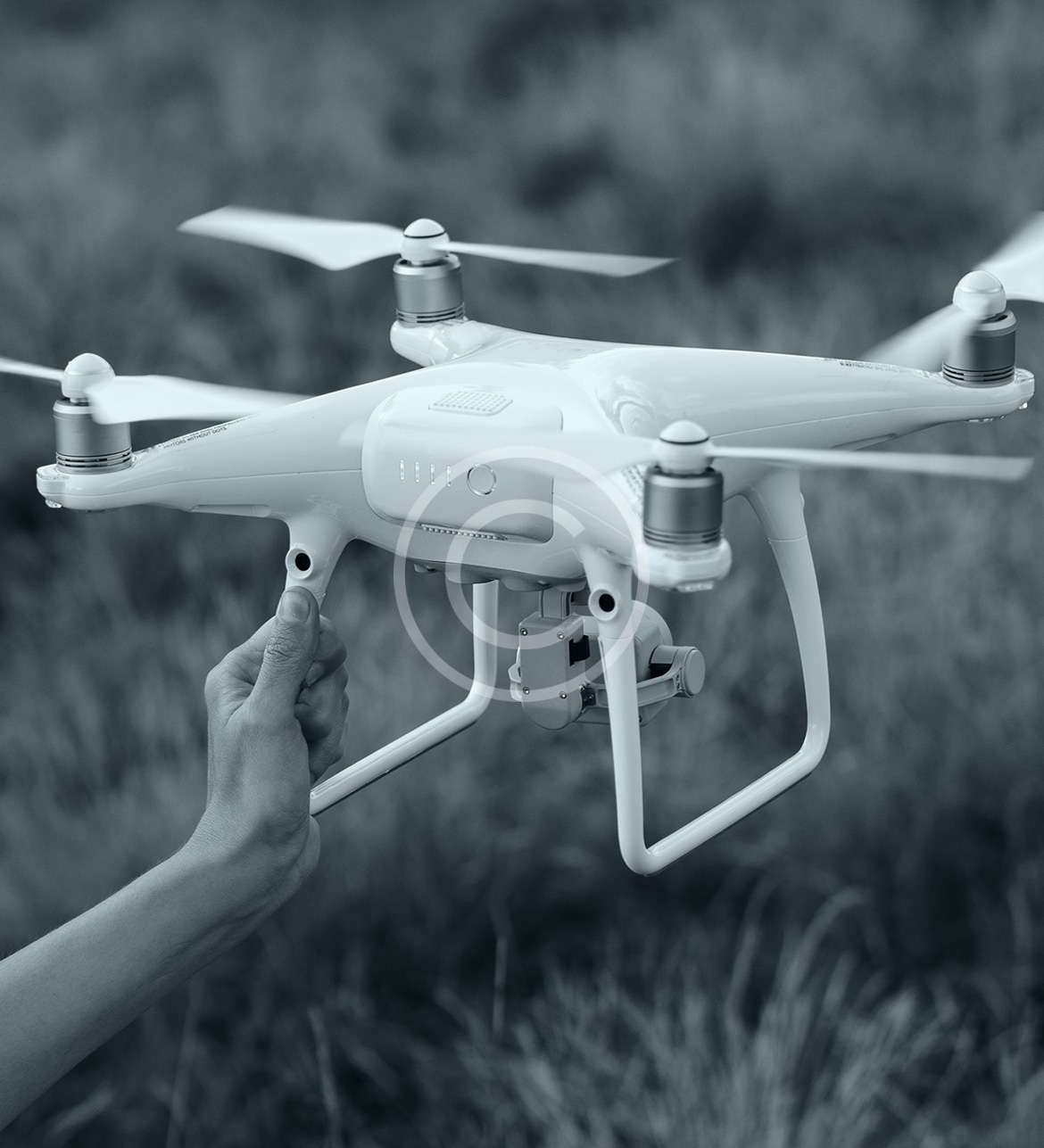 White professional camera drone quadcopter takes pictures. Photographer woman hand holds copter. Horizontal background, copy space, selective focus.